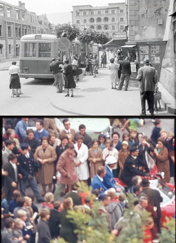 Bildlegende: Dominikanerplatz, 1956, Foto Excelsior, Bildarchiv des Südtiroler Landesarchivs (links), der Olympiasieger Klaus Dibiasi und dessen Vater Karl am Grieser Platz, 31. Oktober 1968, Foto P. Ambros Trafojer, Stiftsarchiv Gries (rechts).